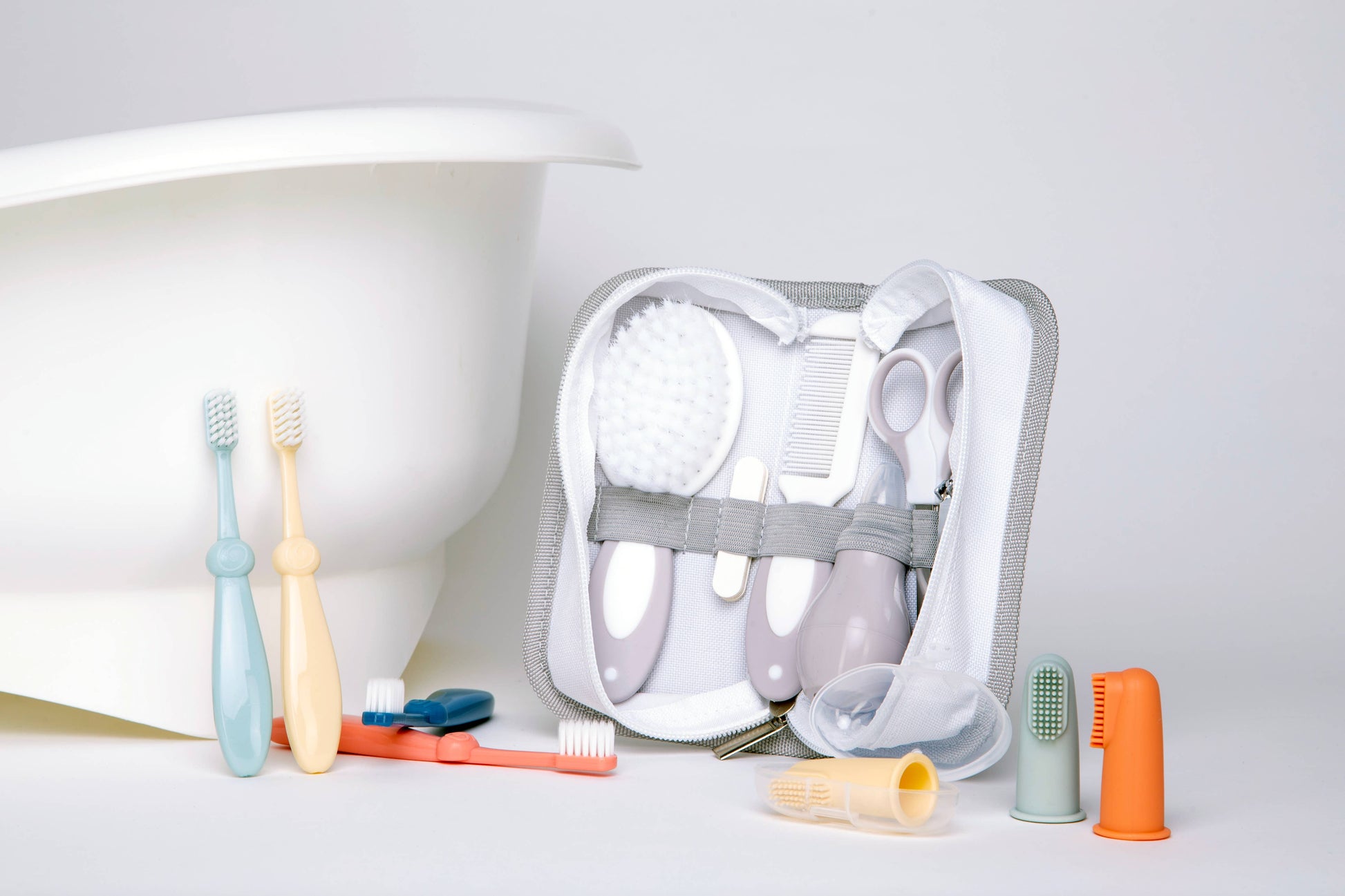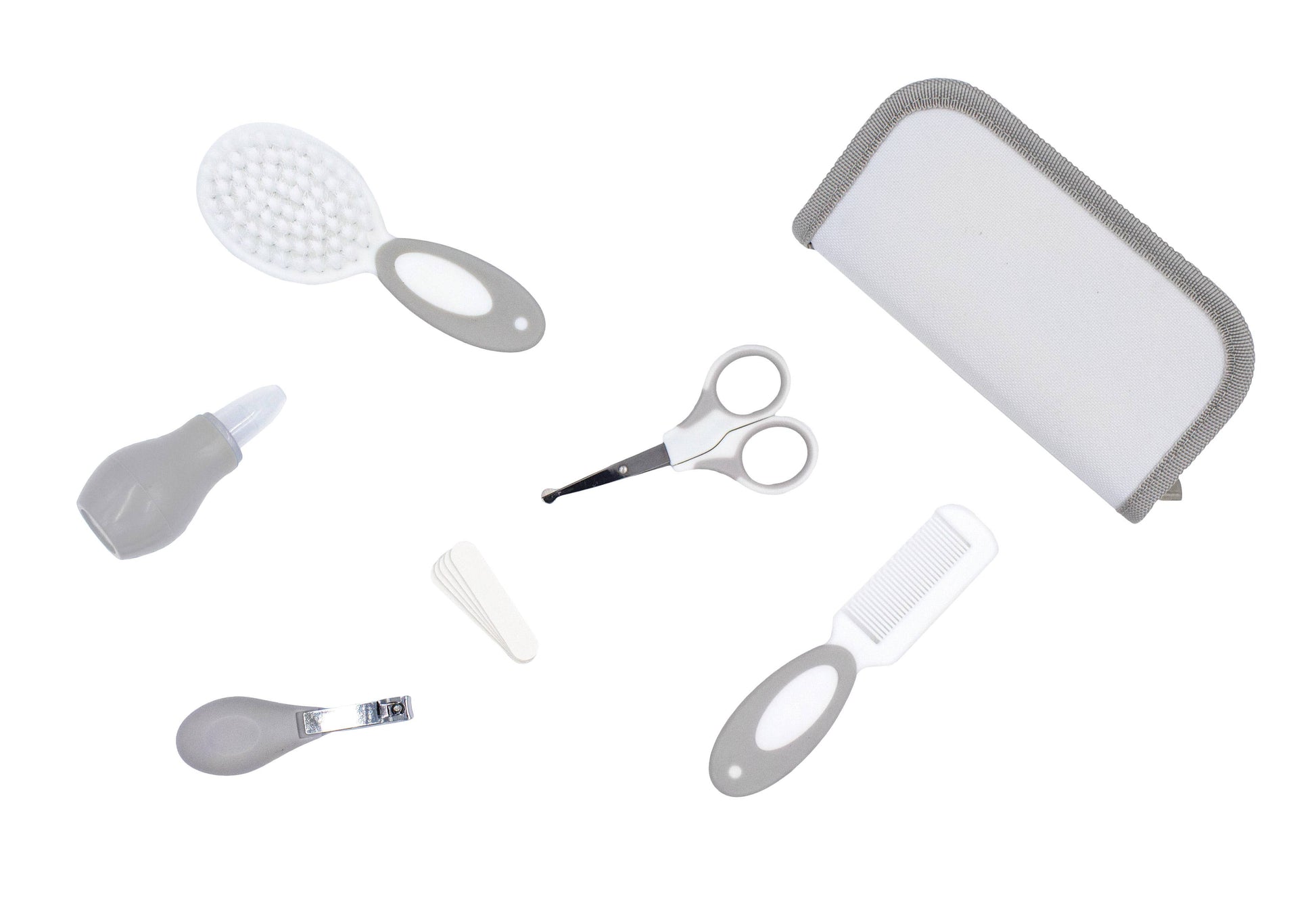 • Set of 11 newborn baby essentials: Soft Hair Brush, Baby Comb, 5 Emery Boards, Nail Clippers, Safety Scissors, Nasal Aspirator and Carrying Case