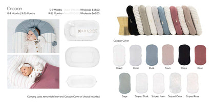 Our Cocoons are ideal for supervised rest + play time, tummy time, baby massages, convenient diaper changes, bonding time, and providing a familiar spot for baby while traveling. Differences between Cocoon and Cocoon+ - All 4 have a plastic carrying case to protect on the go AND a removable liner so you don't have to wash the entire cocoon every time - Cocoon :: include one FREE cover (as shown) - Cocoon+ :: corresponding sized covers will fit both kinds of cocoons and can be purchased separately. Cocoon + has a thicker foam base and is significantly sturdier. Includes carrying handles and a buckle at the bottom to expand the length of the Cocoon by 5”