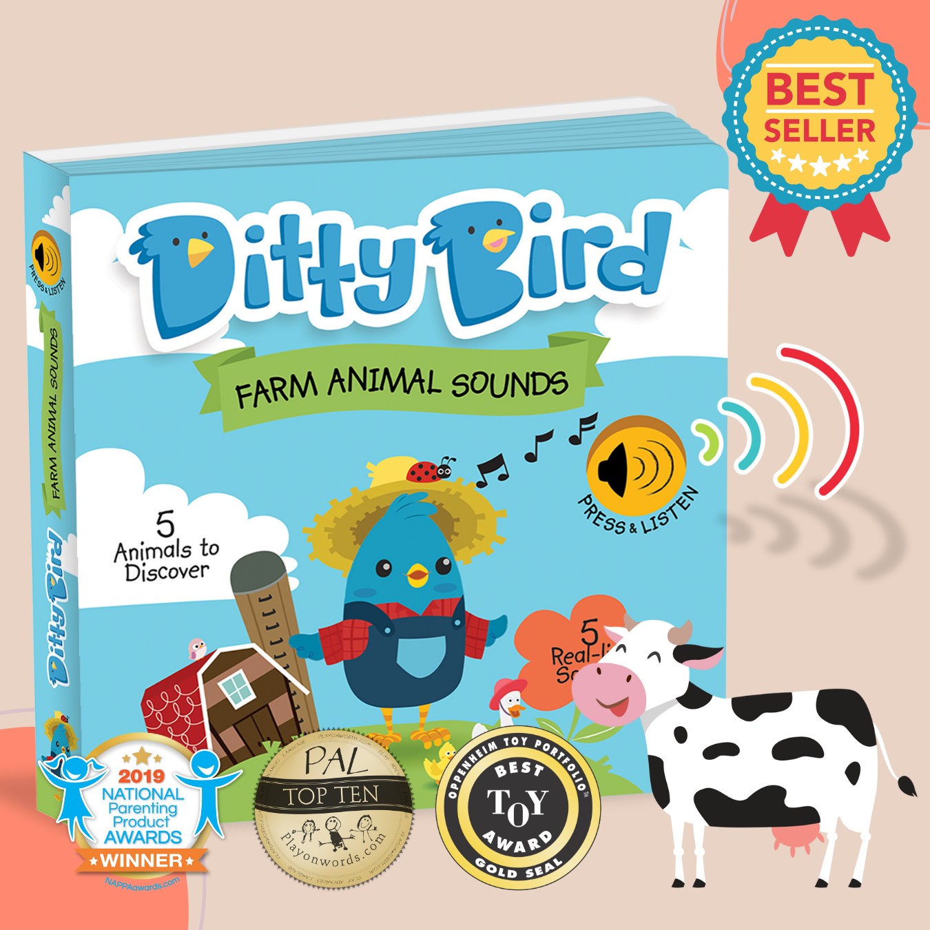 Press the sound button on each page to listen to real-life animal sounds and ‘moo’, ‘baa’, ‘quack’ along with our favorite animal sounds song!