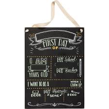 A milestone chalkboard from our Baby & Kids Collection to document your child's first day of school! Features "Name," "My First Day Of," "I Am ___ Years Old," "My School," "My Teacher," "I Want To Be A ___ When I Grow Up," "My Favorite: Book," "Song," and "Food" sections with varying designs. This First Day of School sign contains top fabric loop for easy hanging and is great for gifting. Created with non-toxic paint, our First Day of School sign is designed to capture memories year after year.