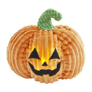 Light-up minky pumpkin. Squeeze to activate spooky noises and Halloween poem with surprise jack-o-lantern face lighting at the end! Batteries included.