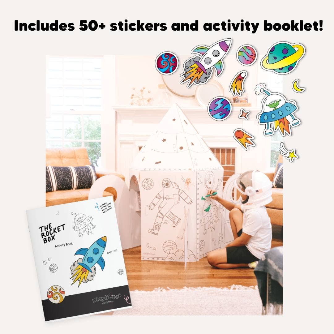 These rocket playhouses are a BLAST of fun for little ones! Hours of screen-free imaginative play that make for a perfect gift of cosmic adventures. Each comes with an activity booklet with kid favorites: 50+ colorful STICKERS, JOKES, fun facts, and activities. Our play boxes are… * Sturdy enough for many hours of active play - we made ours stronger to last longer! * Eco-friendly and recyclable when you're done with all the fun * The perfect creative canvas: premium-quality, easy-to-color white paper inside and out with fun space-themed stenciled artwork * Full of surprises with multiple windows and doors * Perfect as a party activity or gift * Designed, made, and packaged in Dallas, TX, USA Assembled Dimensions: * 52" high x 32" wide x 32" deep This is a small mom-owned business (one woman show!).